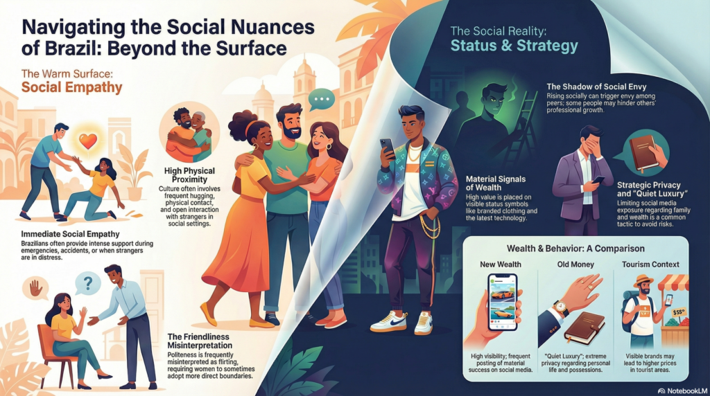 Income levels in Brazil are low for a large part of the population, so people often place a high value on social status and material signs of wealth, such as having the latest iPhone, wearing branded clothes, or owning a car and showing which model or brand it is. The more signals of wealth you show, the better you may be treated. And if you rise socially compared to friends, colleagues, or family, envy can become more visible. Some people even go into debt just to project an image of power and success, so be careful with appearances in Brazil.
